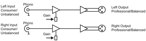 每組通道的左右輸出端均獨(dú)立設(shè)有增益控制,通過后背面板上的微調(diào)電位器設(shè)定。