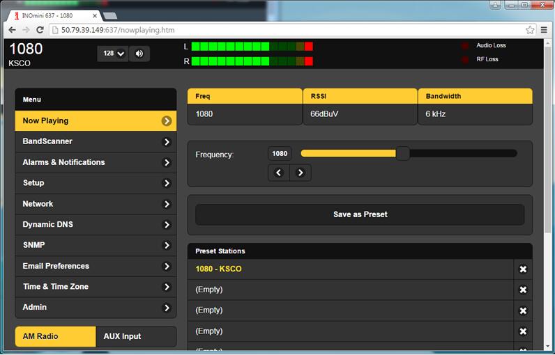 INOmini637是自帶有瀏覽器頁面的用于遠(yuǎn)程信號監(jiān)測的AM信號接收器。將它部署在發(fā)射機(jī)站點(diǎn)或任何關(guān)鍵地理位置,它能夠收集信息并把無線電音頻或有線音頻發(fā)送到任何計(jì)算機(jī),平板電腦或移動設(shè)備。瀏覽器頁面能實(shí)現(xiàn)遠(yuǎn)程調(diào)整,顯示音頻電平及數(shù)據(jù),并記錄信號參數(shù)。參數(shù)和警報(bào)可通過電子郵件,短信和SNMP協(xié)議發(fā)送。INOmini637還支持滾動監(jiān)測Station Rotation?,能夠遍歷儲存的預(yù)設(shè)并根據(jù)各自的設(shè)定發(fā)送報(bào)警。歡迎前來體驗(yàn)INOmini637強(qiáng)大的遠(yuǎn)程控制,只需按照在Web瀏覽器此鏈接即可全權(quán)控制一臺位于美國加州的儀器:model637.no-ip.org,進(jìn)入網(wǎng)頁后您將看到如下效果。您也可以點(diǎn)擊播放按鈕來收聽實(shí)時(shí)廣播。