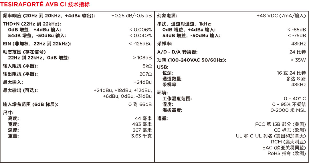 進(jìn)的會議解決方案。TesiraFORTéAVBCI使用音頻視頻橋接(AVB)數(shù)字音頻網(wǎng)絡(luò)、和可以用作獨(dú)立設(shè)備,或與其他TesiraFORTé設(shè)備、TesiraDSPs、擴(kuò)展器和控制器相結(jié)合使用。TesiraFORTéAVBCI還提供了廣泛的音頻處理,包括但不限于:信號路由和混音、均衡、濾波、動態(tài)和延遲以及控制、監(jiān)控和診斷工具,均通過Tesira軟件配置。TesiraFORTéAVBCI是中小型房間的最佳選擇,這類房間需要使用語言擴(kuò)聲和分區(qū)擴(kuò)聲的高品質(zhì)音頻解決方案(如會議室或理事會會議廳)。
