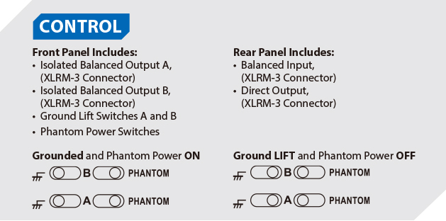 分配器設有三組輸出 - 1 組直接輸出、2 組變壓器隔離輸出,每組輸出端均可同時為話筒連接幻象供電工作。而 2 組變壓器隔離輸出 (A及B) 同樣設有地線連接開關,可幫助解決因地線回路產生的噪音。將開關推向右時,地線會設于分離狀態(tài);將開關推向左時,地線會設定為連接。另外 A 及 B 輸出均設有幻象供電開關,可個別控制不同調音臺到話筒的幻象供電安排。