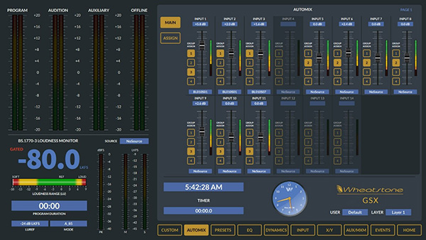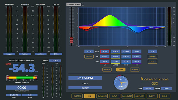 GSX無縫連接到WheatNet-IP智能網(wǎng)絡,并利用BLADE在單根CAT6互連電纜上傳輸音頻,控制和相關邏輯數(shù)據(jù)。該系統(tǒng)幾乎可以提取和轉換所有音頻格式:麥克風和線路電平模擬,AES / EBU,SPDIF,AoIP,MADI,SDI甚至是AES67。包括響度測量,相位控制和完整的EQ / Dynamics。