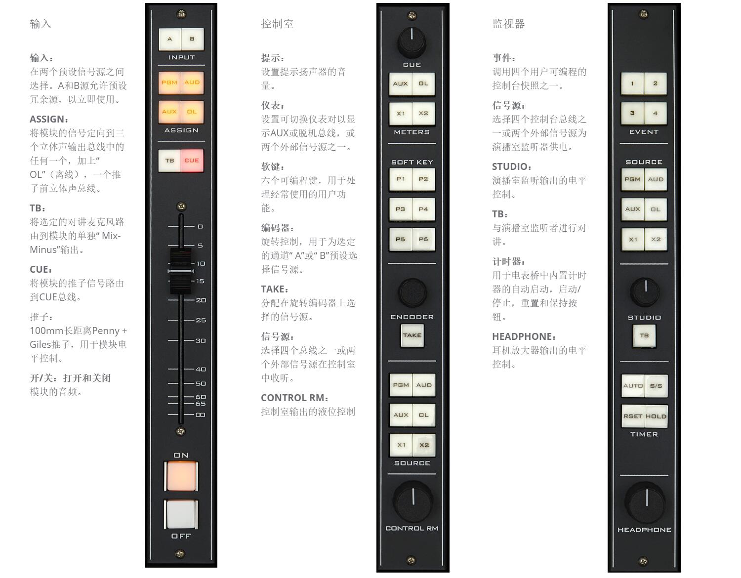 主控部分提供帶有信號(hào)源選擇的控制室,錄音室和耳機(jī)控制,以及板載放大器和耳機(jī)插孔。提供了計(jì)時(shí)器控件,主對(duì)講按鈕和帶有音量控制的內(nèi)置提示揚(yáng)聲器。有四個(gè)事件開關(guān)和六個(gè)可編程按鈕可用于用戶功能。?